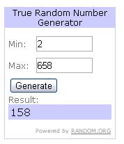 Foram recebidos 658 e o número sorteado foi o 158. (Não coloquei de 1 à 658, pois o número 1 no google docs é apenas a descrição do que cada coluna vai direcionar, os dados dos inscritos são mostrados a partir do número 2)