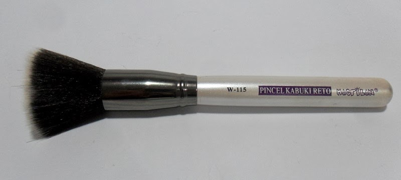 Pincel Kabuki Preto W-115: Esse pincel é da linha profissional da Macrilan e de inicio o comprei para aplicação de base líquida, ele tem o formato no estilo do F80 da Sigma. Porém esse da Macrilan é super molenguinho, ele não tem muita cerdas e depois de tantas lavagens ele ficou super abertão, então acabo utilizando-o para aplicação de pó.